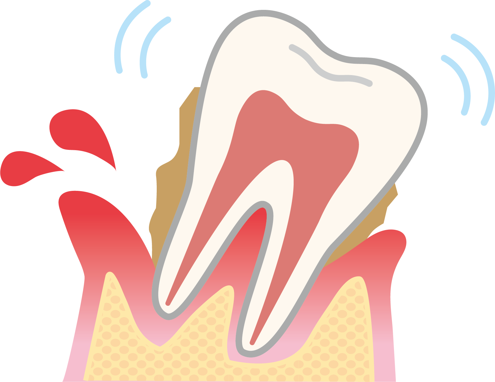 歯周病が進行すると、歯ぐきが歯から離れ(歯周ポケットが深くなる)、歯がグラグラしたり、ぐらぐらして抜けたりすることがあります。また、歯を支える骨が溶けて吸収されてしまうため、歯が抜けやすくなることもあります。
